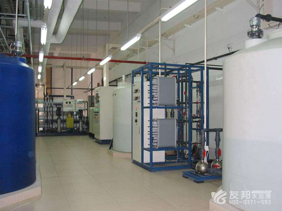 原水→原水加壓泵→多介質過濾器→活性炭過濾器→加藥裝置→精密過濾器→第一級反滲透 →PH調節→中間水箱→第二級反滲透→中間水箱→中間水泵→EDI系統→微孔過濾器→用水點