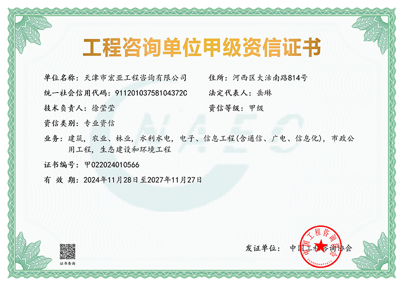 根據(jù)中國(guó)工程咨詢協(xié)會(huì)2024年第17號(hào)公告,天津咨詢所屬宏亞咨詢公司成功獲得建筑,農(nóng)業(yè)、林業(yè),水利水電,電子、信息工程(含通信、廣電、信息化),市政公用工程,生態(tài)建設(shè)和環(huán)境工程等6個(gè)專業(yè)甲級(jí)資信,并成功升級(jí)為甲級(jí)綜合資信。